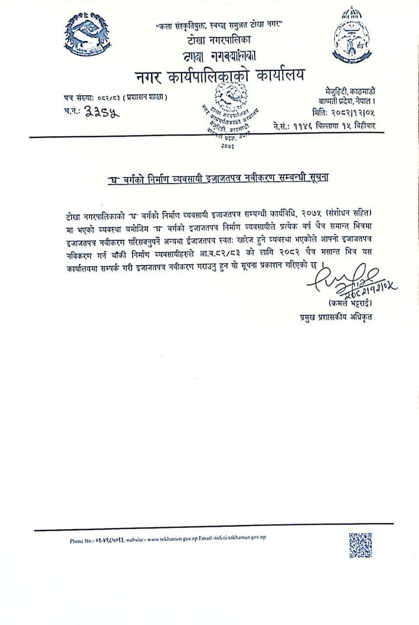 » 'घ' वर्गको निर्माण व्यवसायी इजाजतपत्र नवीकरण सम्बन्धी सुचना