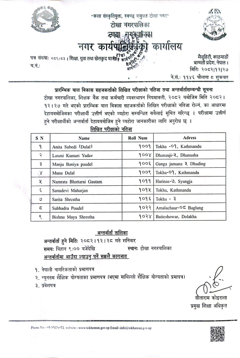 प्रारम्भिक बाल विकास सहजकर्ताको लिखित परीक्षाको नतिजा तथा अन्तर्वार्ता सम्बन्धी सूचना