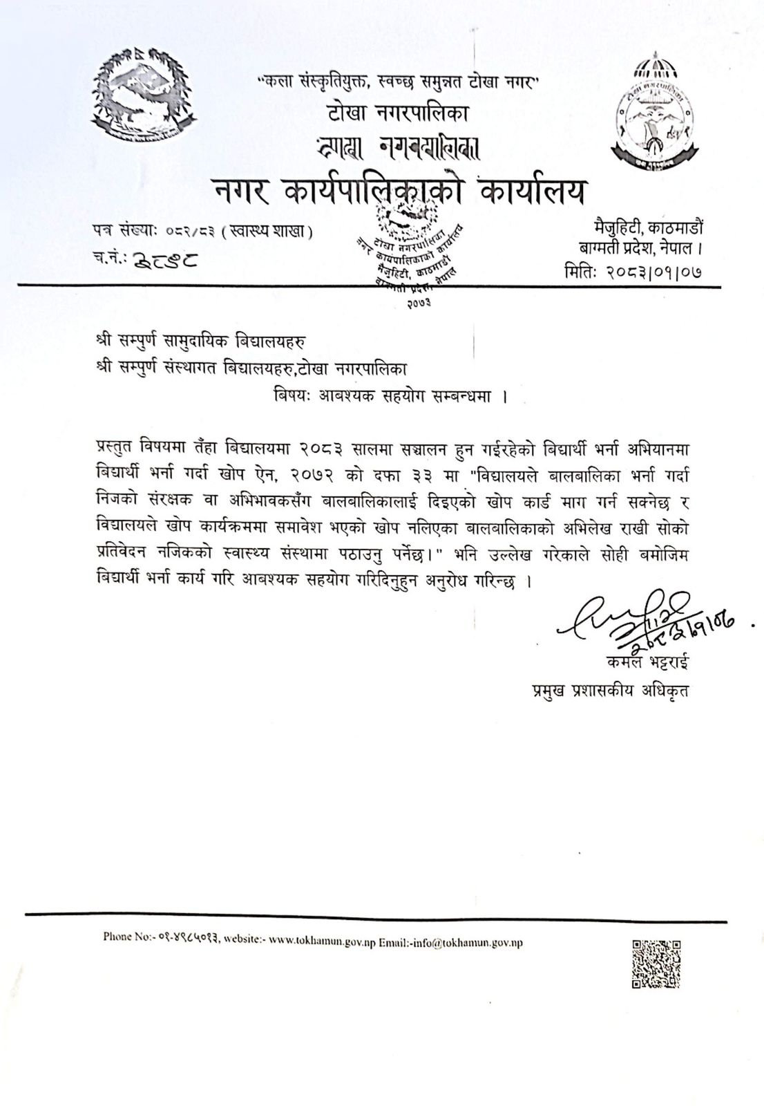 आवश्यक सहयोग सम्बन्धमा (श्री सम्पूर्ण सामुदायिक तथा संस्थागत विद्यालयहरू टाेखा न.पा)