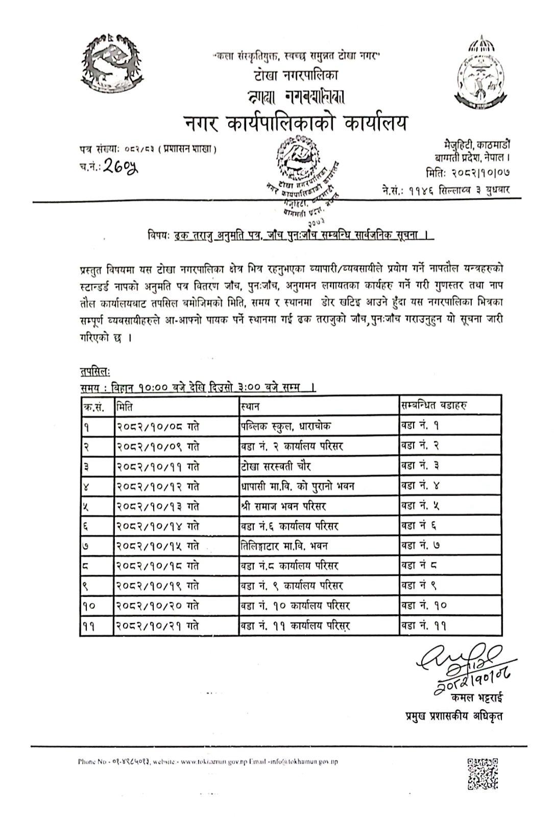 ढक तराजु अनुमति पत्र जाँच पुन:जाँच सम्बन्धि सार्वजनिक सूचना