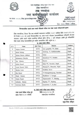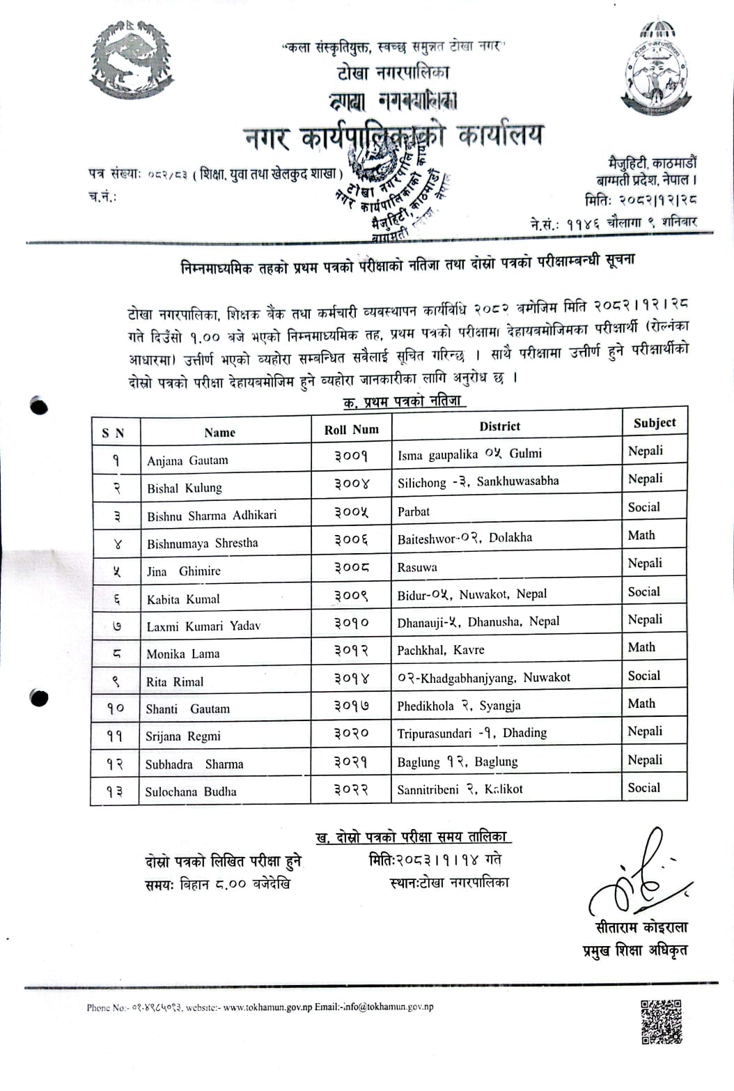 निम्न माध्यमिक तहको प्रथम पत्रको परीक्षाको नतिजा तथा दोस्रो पत्रको परीक्षा सम्बन्धी सूचना