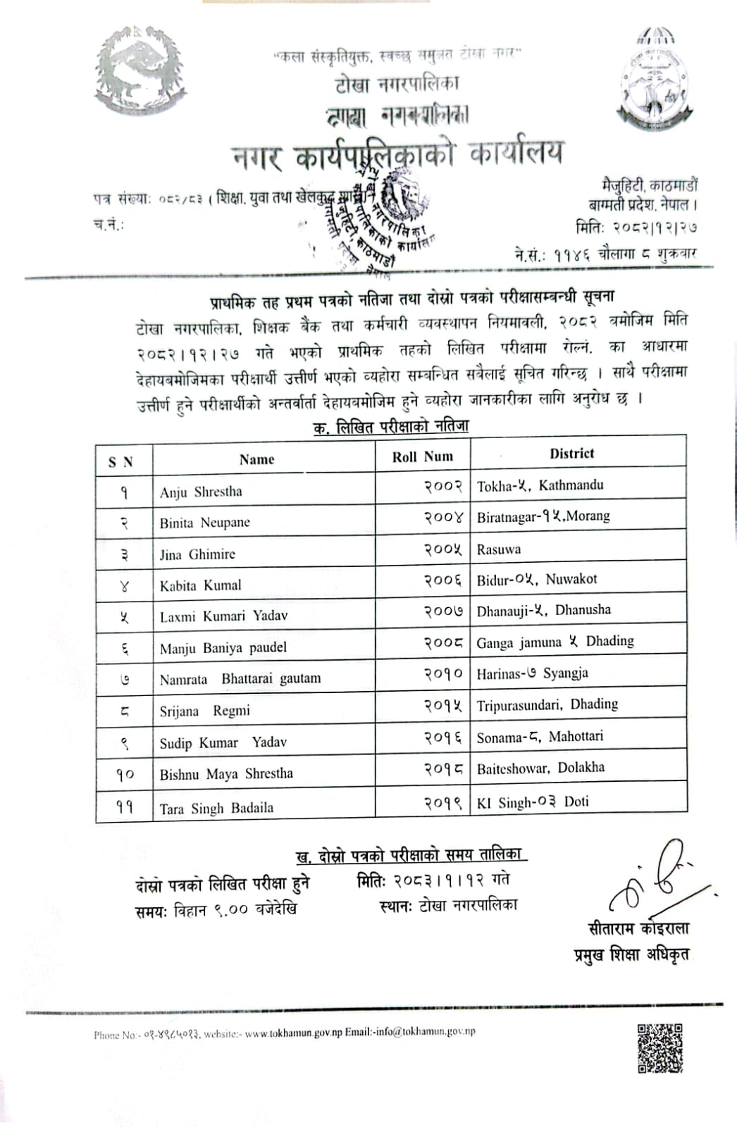 प्राथमिक तह प्रथम पत्रको नतिजा तथा दोस्रो पत्रको परीक्षा सम्बन्धी सूचना