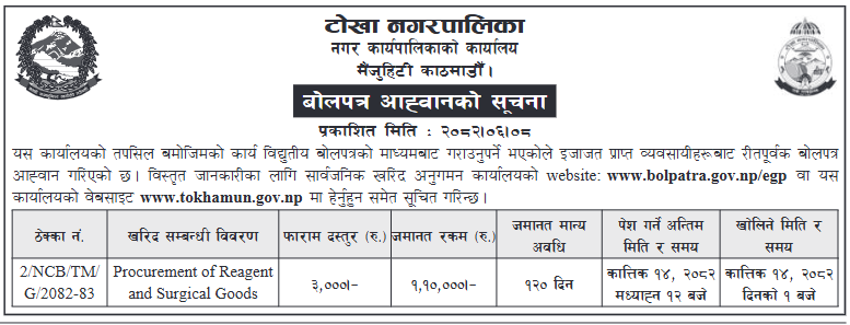 बोलपत्र आह्वानको सूचना - Reagent and Surgical Goods (मिति २०८२/०६/०८ को गोरखापत्रमा प्रकाशित )