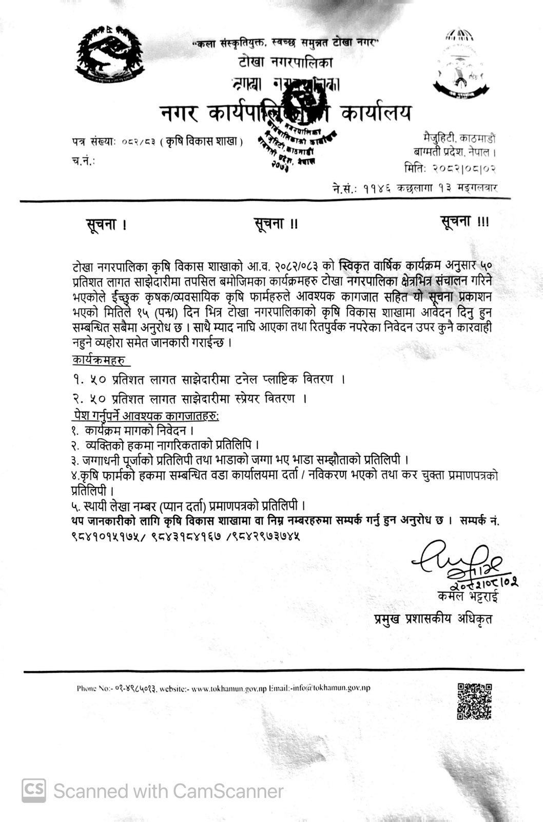 ५० प्रतिशत लागत साझेदारीमा कृषिजन्य सामग्री वितरण सम्बन्धि सूचना