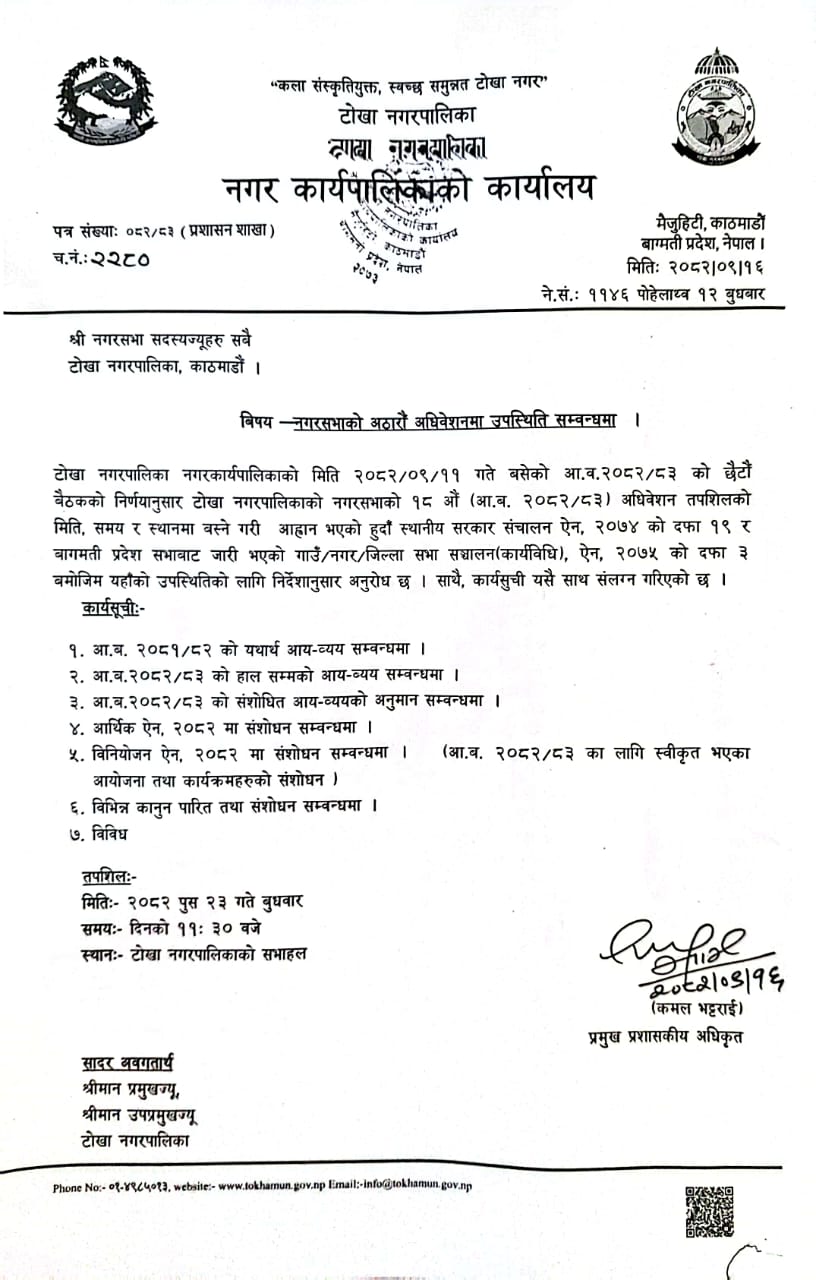 नगरसभाको अठारौँ अधिवेशनमा उपस्थिति सम्बन्धमा