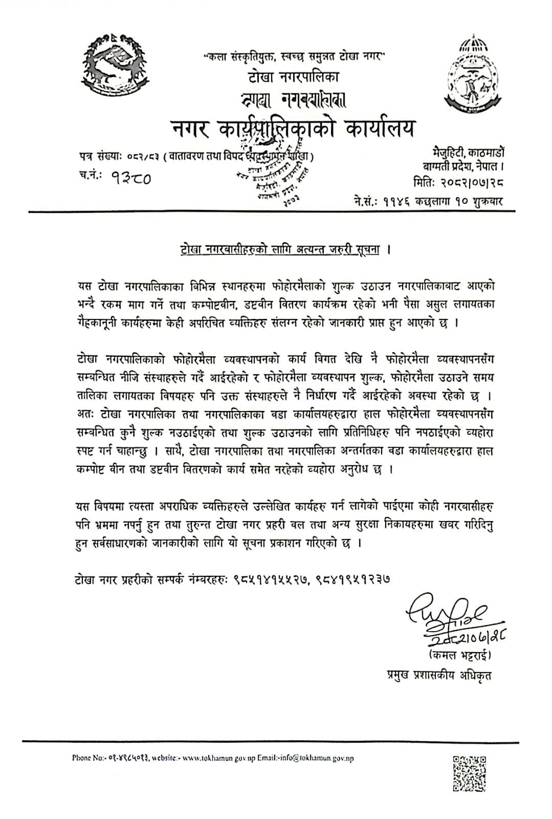 टोखा नगरवासीहरुको लागि अत्यन्त जरुरी सूचना