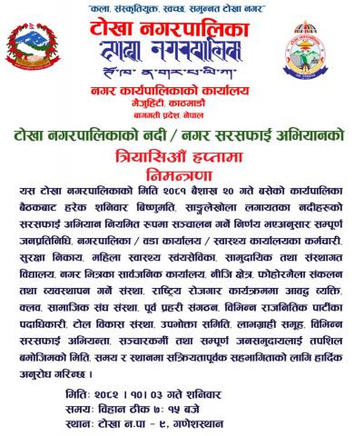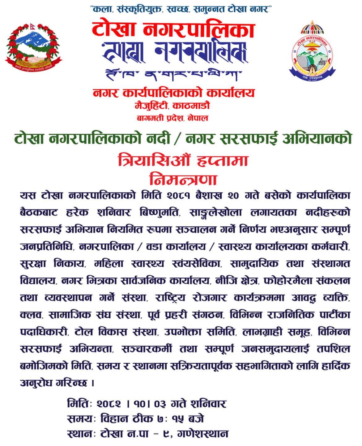 » नदि सरसफाई अभियानको त्रियासीऔं हप्तामा हार्दिक निमन्त्रणा