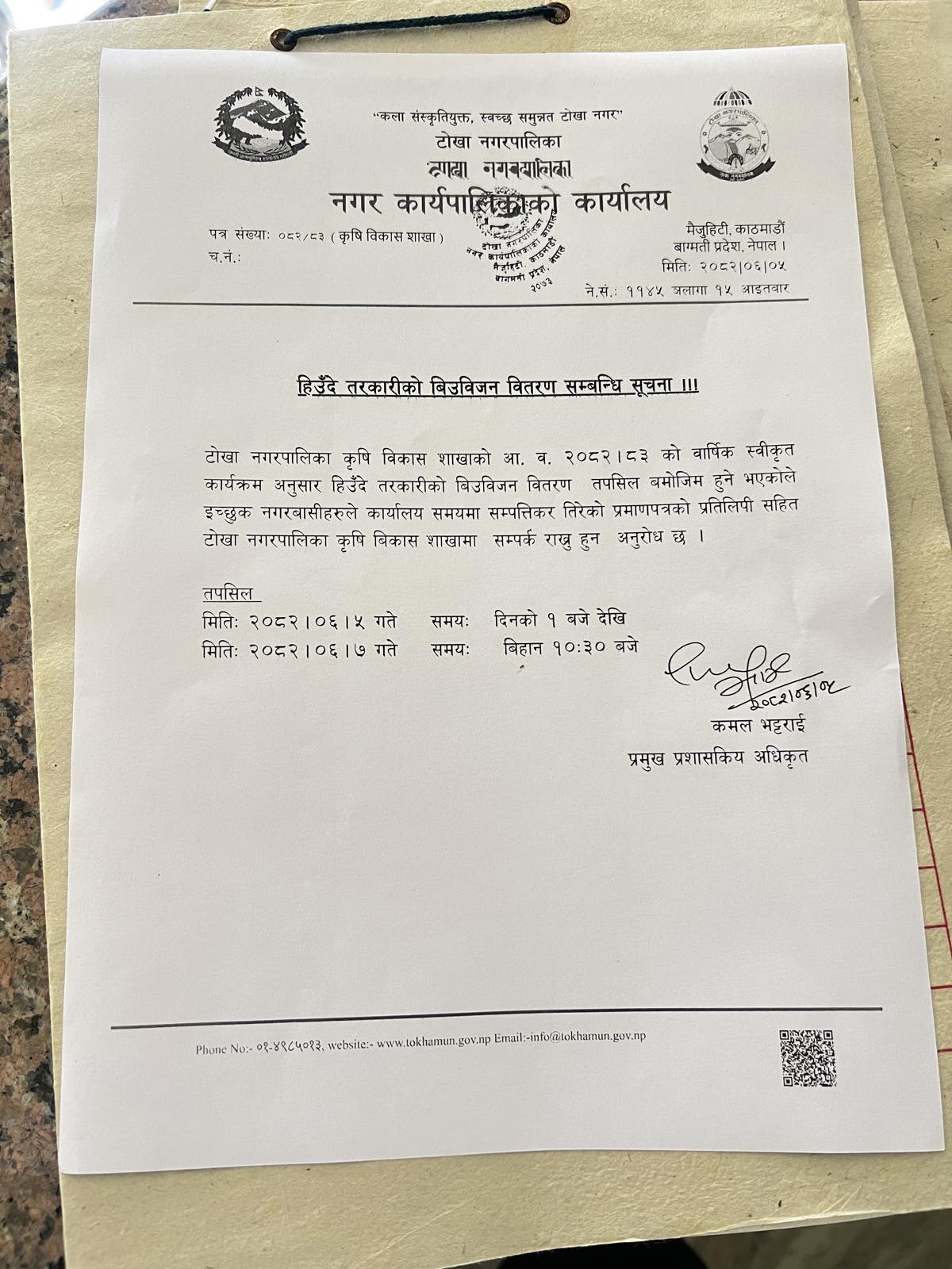 हिउँदे तरकारीको बिउविजन वितरण सम्बन्धि सूचना